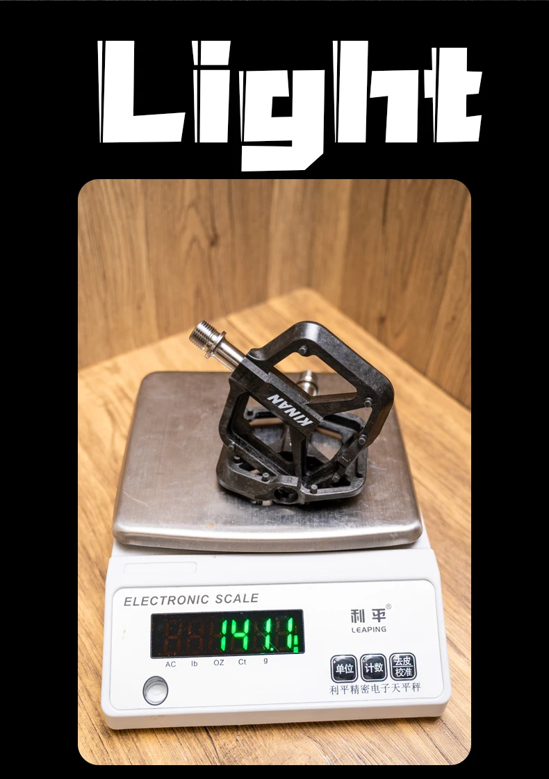 Ultra-light Carbon Titanium Pedals – 141g with 4 Bearings & Anti-slip SurfaceHeavy pedals killing your cadence or feeling unresponsive on climbs? These full carbon body pedals with titanium alloy axle are only 141g per pair – delivering pro-level lightness, smooth rolling, and confident grip for MTB, road, or gravel riding.High-modulus carbon body + titanium axle + 4 sealed bearings = minimal friction and maximum durability. Aggressive anti-slip pins provide secure foot hold even in wet/muddy conditions.The ultimate lightweight, high-performance pedal upgrade in 2026!Key Benefits: