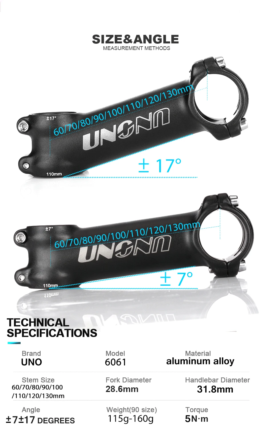 UNO Ultralight Stem – Dial In Your Perfect PositionReach too short or posture feeling cramped on road or MTB rides? The UNO ultralight stem gives you multiple angles (7° for aggressive aero, 17° for balanced comfort) and lengths from 60mm to 130mm to fine-tune your fit exactly.CNC machined aluminum keeps it lightweight yet strong for precise steering and power transfer. 31.8mm clamp fits most modern bars.Affordable upgrade for better handling, less strain, and more confidence in 2026!Key Benefits: